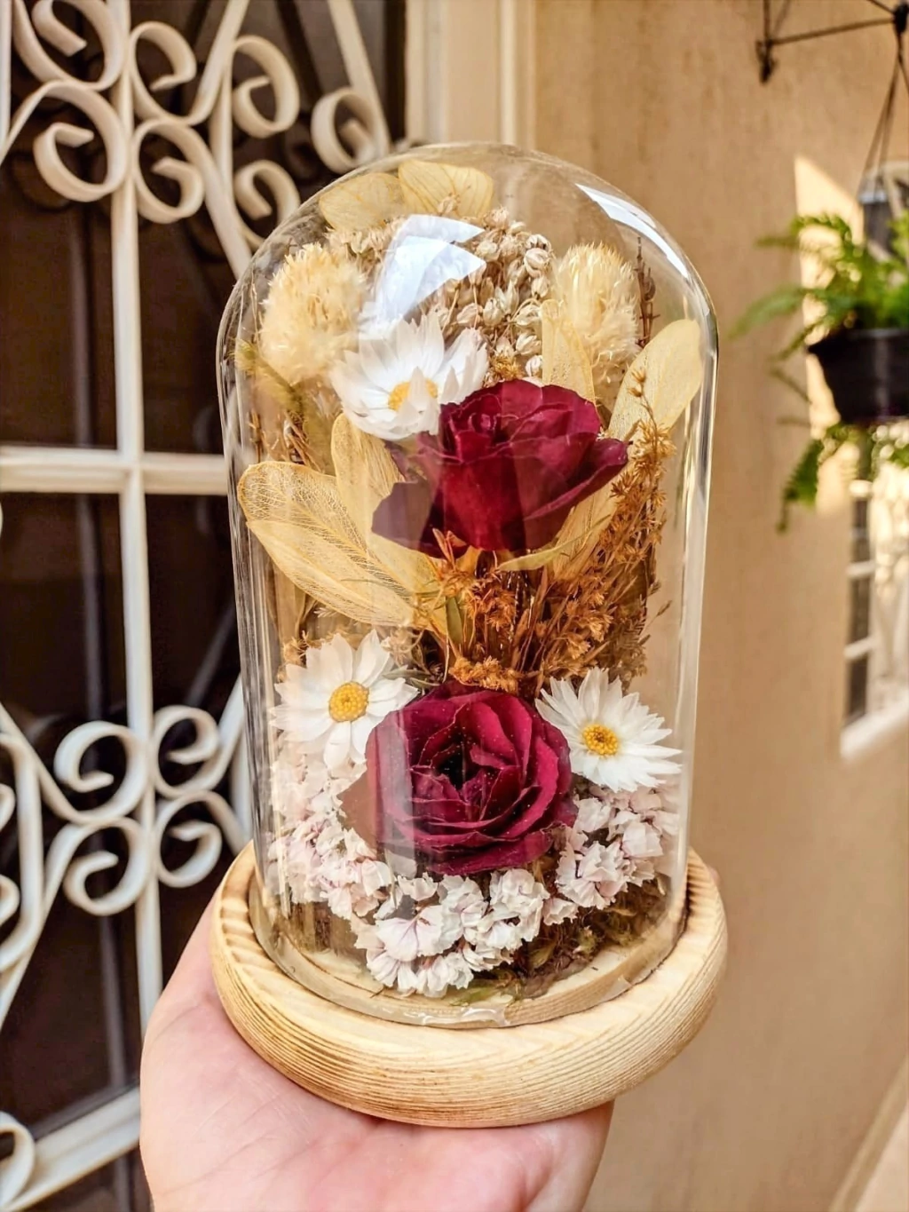 Encante com a delicadeza da natureza preservada. A Cúpula Jardim de Rosas e Sempre-Vivas é um arranjo floral artesanal, feito com flores e folhas naturais desidratadas, que celebra o romantismo e a beleza eterna das flores. Ideal para presentear ou decorar com charme e afeto.